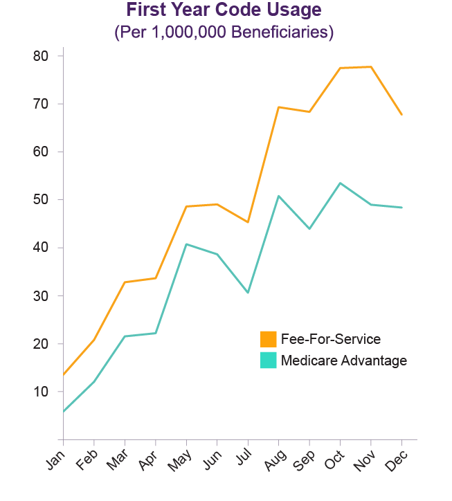 The good news is that as more people and providers become aware of the benefit, the more it is used. In 2017, the number of people who received care planning steadily increased over the course of the year. In January, fewer than 500 people received the benefit, but in December, more than 2,000 did. Use of the code was more than three times greater in the fourth quarter of the year than the first quarter (3.3 times in FFS plans and 3.8 times in MA plans).